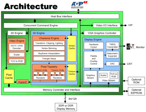 - Движок рендеринга Pixel Tapestry, позволяющий использовать три блока текстурирования на каждом конвейере рендеринга пикселей