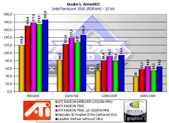 Хорошо видно, что в 16-битном цвете RADEON 7500 сильно проигрывает конкурентам от NVIDIA (и даже разгон не помогает), но зато в 32-битном цвете продукт от ATI уже в разрешении 1024х768 догоняет GeForce2 Pro, а при разгоне даже GeForce2 Ultra. Учитывая достаточную мощь рассматриваемых карт, можно с большой уверенностью предположить, что 32-битный цвет станет наиболее используемым в 3D.