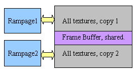 Применение чипов растеризаторов с собственными шинами памяти увеличит ее эффективную пропускную способность. Но у любого плюса, разумеется, есть и свои минусы. В первую очередь мы сталкиваемся с высокой ценой многочипового ускорителя. Во вторую, мы вынуждены дублировать текстуры в локальной памяти чипа. Это уже хорошо известные аспекты. А вот и новый — нам не ясно где мы будем хранить геометрию. Делать еще один локальный геометрический буфер для Sage слишком расточительно. Значит надо: