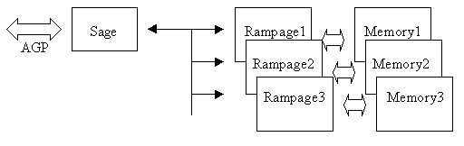 Итак, теперь мы обратим свой взгляд на геометрический процессор, и по совместительству, полноценный AGP мост — Sage. Функциональность моста позволит использовать двух и четырех чиповые карты на его базе в AGP режиме (даже под Windows 2000). Внешний геометрический процессор штука весьма противоречивая. Мы уже касались покрытого мраком вопроса о том, как Sage кэширует геометрию. Но возникает еще один вопрос — правда ли, что он обеспечивает полную AGP функциональность или растеризаторы вновь не способны осуществлять AGP текстурирование? Хотя, используется оно, если честно, ныне нечасто…