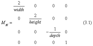 где width, height и depth это ширина, высота и глубина проективного объёма. В этом случае (ортографическое преобразование) не требуется гомогенизация.