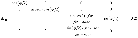 — угол зрения, aspect — отношение ширины к высоте экрана (при отрисовке в квадратную текстуру aspect=1), far и near — дальняя и ближняя стенки проективного объёма соответственно. После перспективного преобразования необходима гомогенизация, как и в случае локального источника при преобразовании "на землю".
