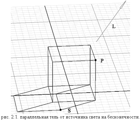если принять, что L это вектор из точки P к источнику света, то точку S можно выразить как