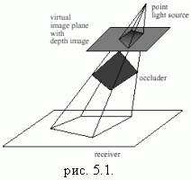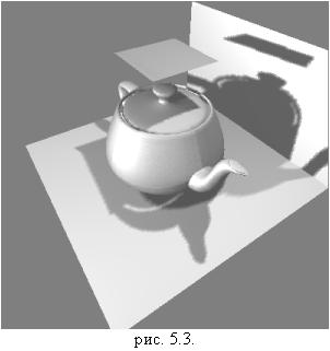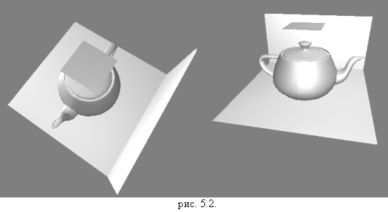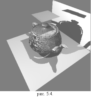 На рис. 5.2. изображена сцена с точки зрения источников света (не образ глубины), а на рис. 5.3. — сцена с точки зрения наблюдателя с построенными тенями.