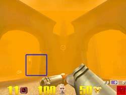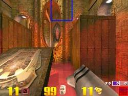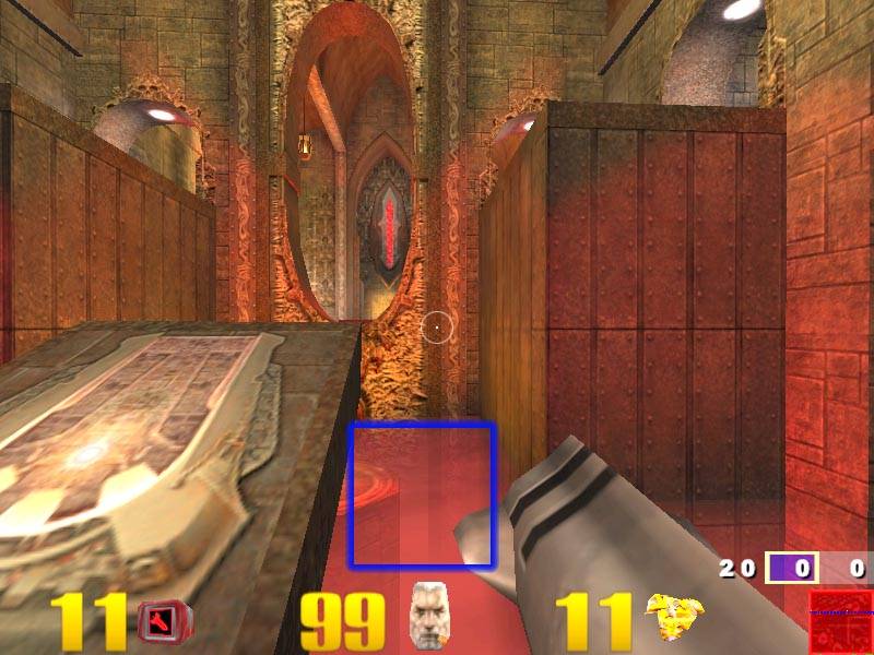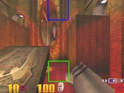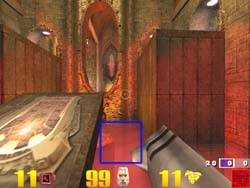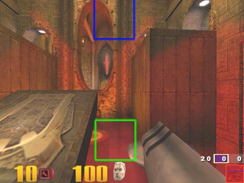 Таким образом, мы можем сказать, что практически все акселераторы, выводящие 3D-графику в 16-битном цвете, обладают некоторыми артефактами в виде побочных результатов реализации дизеринга, однако NVIDIA GeForce 256 наиболее лучшим образом реализует эту функцию. К сожалению, расхваленный постфильтр на 3dfx Voodoo3 помогает мало. Скриншот ниже демонстрирует нам другую сцену в Quake3, полученную на 3dfx Voodoo3:
