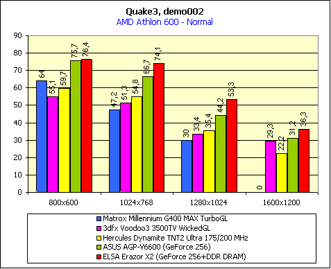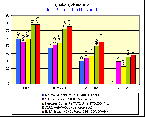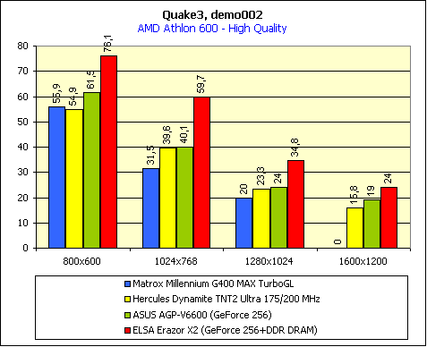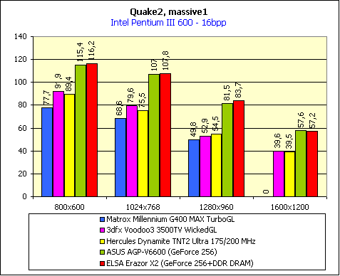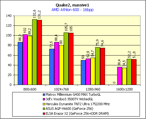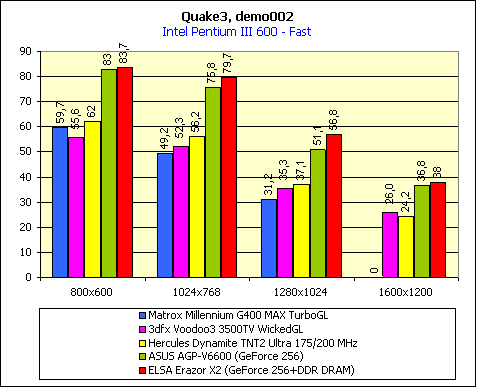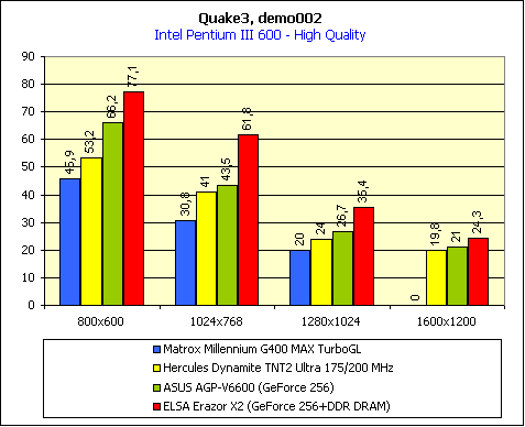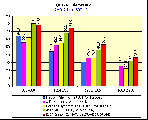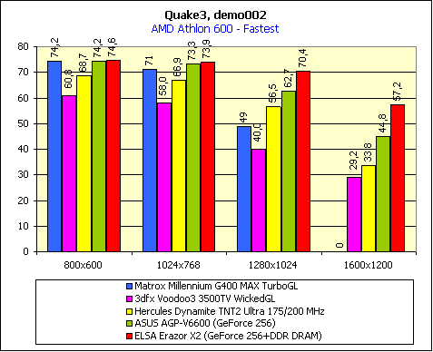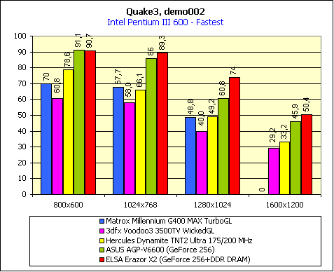 Картина не изменилась, можно лишь дать комментарий, что 3dfx Voodoo3 3500TV при помощи драйвера WickedGL смогла не только обогнать Hercules Dynamite TNT2 Ultra в самом тяжелом разрешении 1600х1200, но и сравняться по скорости с ASUS AGP-V6600!