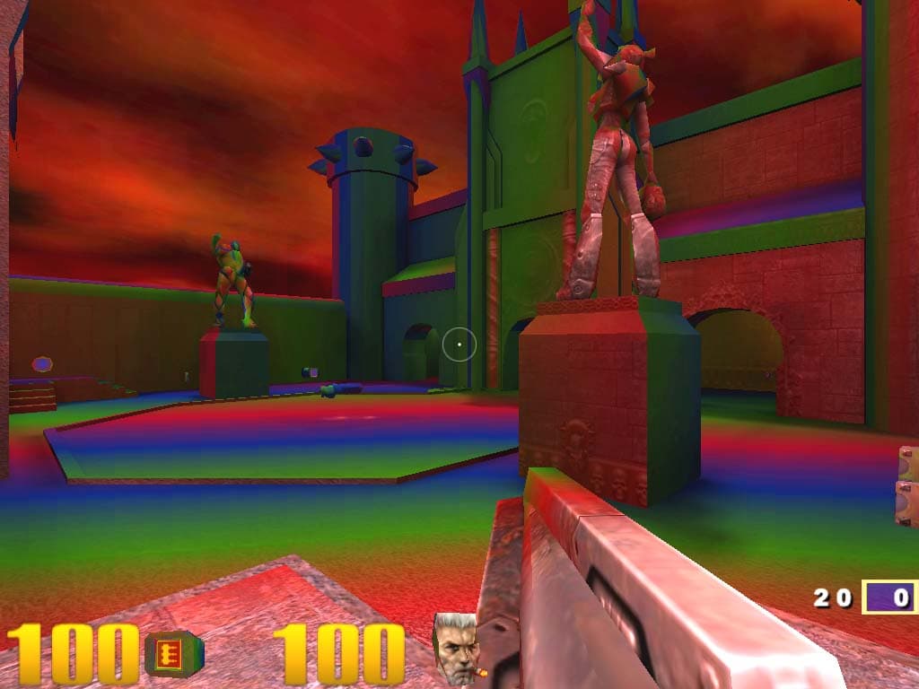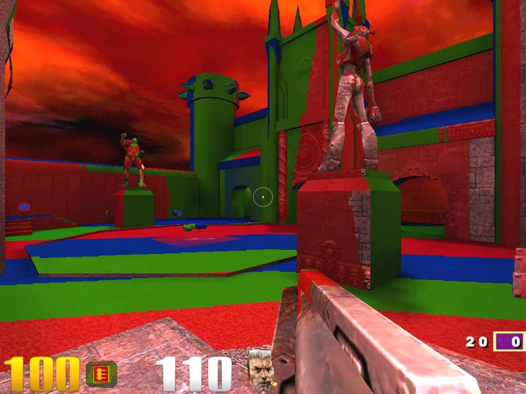 C первого взгляда, два последних скриншота вроде бы не различаются, хотя в динамике отличия видны. Если мы включаем трилинейную фильтрацию совместно с компрессией текстур, то MIP-уровни, вернее, границы между ними, все равно видны, хотя и не так это бросается в глаза. В чем же тут дело? Давайте теперь раскрасим MIP-уровни при помощи переменной r_colorMIPLevels 1 :
