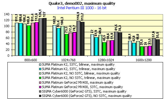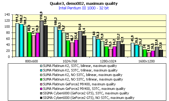 Для сравнительного анализа были использованы показания с видеокарт SUMA Platunum GeForce2 MX400 PowerUp (200/183 MHz), SIGMA Cyber6000 (GeForce2 GTS, 32MB).