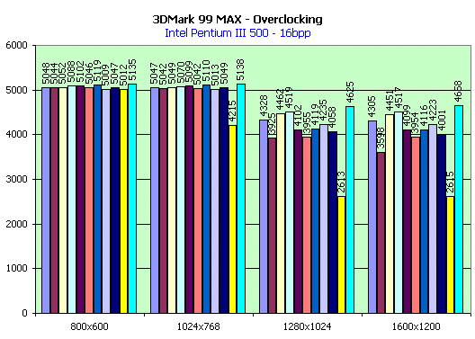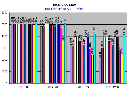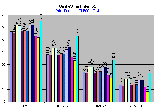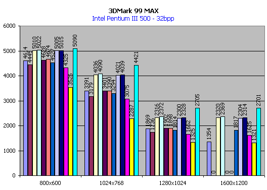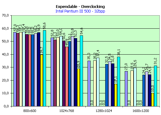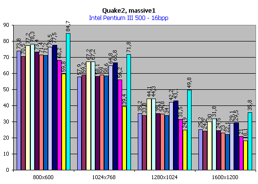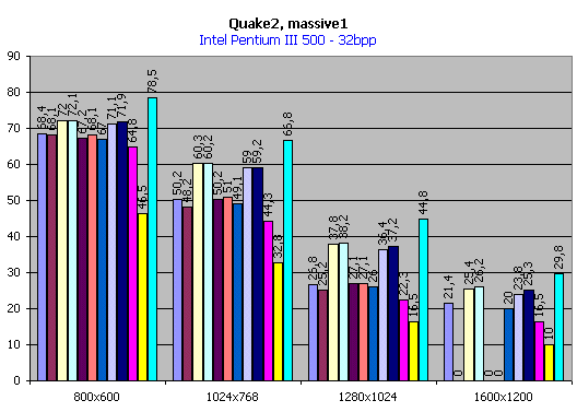 варианты карт в разрешении выше 1024х768 при 32-битной глубине цвета выдавали либо ошибки, либо заведомо ложные результаты (как например, давал 3D Mark99 MAX одинаковые значения для 1280х1024х32 и 1600х1200х32). Quake2 и Quake3 на 16-Мбайтных картах в разрешениях выше 1024х768х32 просто зависали или вылетали с ошибкой, а также необходимо отметить, что на 16-мегабайтных картах в 32-битном цвете было значительное падение в скорости по сравнению с их аналогами, но с 32-ю мегабайтами памяти, что опять-таки дает повода для размышлений насчет того, как работает AGP. Игра Expendable на таких же картах и при 1280х1024х32 и выше выдавала ошибку по нехватке локальной видеопамяти. Именно поэтому ряд результатов на диаграммах отсутствует