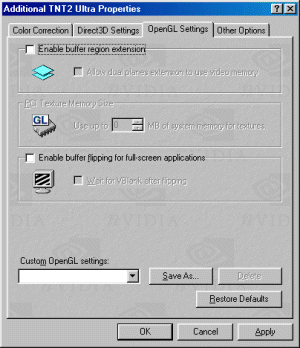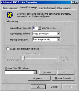 Таким образом, мы рассмотрели все основные параметры настройки драйверов от nVidia для чипсета nVidia Riva TNT2. Все наше тестирование проводилось при установках по умолчанию.