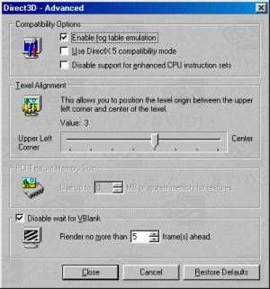- Совместимость с DirectX 5.0 (Use DirectX 5.0 compatibility mode). За таким, казалось не таким нужным параметром скрывается много. DirectX 6.x отличается от DirectX 5.0 в том числе и тем, что вводит такой способ работы 3D-ускорителя, как мультитекстурирование. Драйвер от nVidia устроен так, что при входе в игру он определяет, поддерживает она этот метод работы или нет (естественно, при наличии DirectX 6.x). Если поддерживает, то nVidia Riva TNT (2) будет работать в режиме мультитекстурирования, что не является для этого чипсета основным, поскольку при возрастании скорости наложения текстур (вместо одной — две за раз) падает вдвое скорость обработки пикселей (вместо двух — один за раз) так как чипсет nVidia Riva TNT2 имеет двухконвейерную структуру. Включение этой опции дает возможность принудительно задать режим работы чипсета в двуконвейерной конфигурации (то есть отключить режим мультитекстурирования), несмотря на поддержку игрой мультитекстурирования. В некоторых случаях, это дает явный выигрыш на играх, не поддерживающих мультитекстурирование. Оперировать с этой опцией следует опытному человеку, знающему особенности той или иной игры.