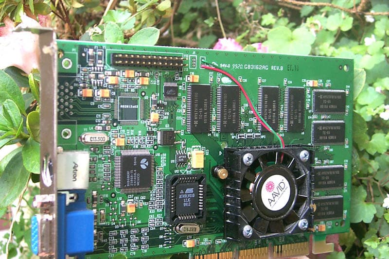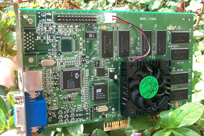 Видеокарта имеет AGP 4x конструктив и TV-out. Как теперь принято, ТВ-выход представляет собой гнездо S-Video, а в поставку входит переходник S-Video-Composite. Плата снабжена 32 Мбайтами 5.5 ns памяти, расположенной по обеим сторонам карты (таким образом, плата в целом мало отличается дизайном от предыдущей). На чипсете установлен активный кулер. Причем, не приклеен, а смонтирован на крепеже (мы уже много раз утверждали, что этот способ монтажа охладительной системы намного эффективнее приклеивания кулера к чипсету). Да и сам вентилятор, как можно убедиться, глядя на фотографию, намного более эффективен, чем все рассматриваемые выше.