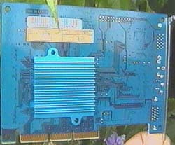 Эта видеокарта необычного синего цвета имеет AGP 4x конструктив, 32 Мбайта SDRAM 7 ns памяти, расположенной в четырех 64-мегабитных модулях. Как можно видеть, отличие этой карты от остальных не только в цвете печатной платы, но и в наличии охлаждающего радиатора с задней стороны карты. Правда, высота ребер этого радиатора очень невелика, поэтому эффект от него не столь существенен. Однако, сам факт наличия дополнительного радиатора, помимо активного кулера на чипсете, может свидетельствовать о подготовленности работы карты на более высоких частотах, что и было выявлено позже.