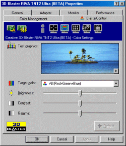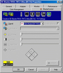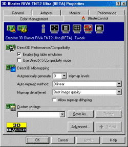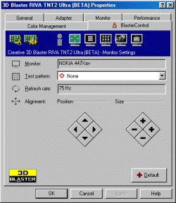 BIOS — версии 2.05.13, драйвера, поставляемые с картой, базируются на референс 1.20. Должен отметить, что фирма Creative постоянно работает над выпуском новых драйверов, поэтому на момент написания обзора уже вышли драйвера, основанные на референс 2.03. Драйвера выполнены в стиле Creative с одной закладкой Blaster Control, которая дает практически те же функции по настройке 3D, что и эталонные драйвера от nVidia,