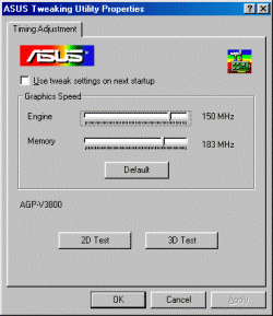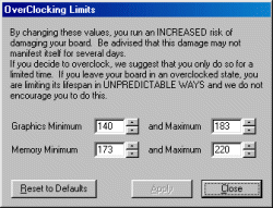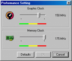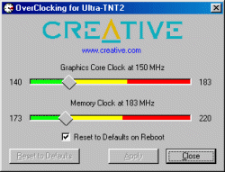 По умолчанию карта тактуется на 125/150 МГц как обычные nVidia Riva TNT2-карты. Максимальные значения частот устойчивой работы платы достигли 150/220 МГц. Естественно, что для получения таких частот потребовалось прикрепить на радиатор вентилятор.