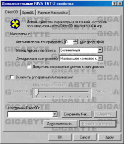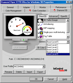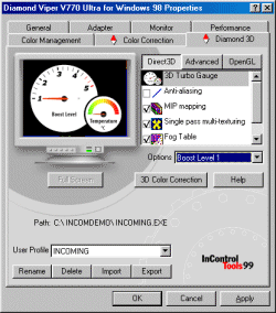 Как видим, все настройки 3D построены по принципу профилей для каждого приложения. То есть, если еще не было запущено ни одной 3D-игры, настроить 3D-графику просто невозможно. Таким образом, надо сначала запустить игру, убедиться, что она работает некачественно или плохо, а потом уже идти менять настройки для нее. Привязка профиля идет к имени запускаемого EXE-файла. Опять-таки, если игру переместить в другое место или переинсталлировать, то все настройки надо делать заново. Мне лично это очень не понравилось. Также можно обратить внимание на параметр 3D Turbo Gauge. Это и есть обещанная фирмой Diamond утилита для разгона. Она работает путем выставления одного из пяти уровней Boost Level. При этом нет ни слова о том, какая же частота включается на самом деле. Самое интересное, когда я запустил утилиту PowerStrip 2.51, то она никоим образом не реагировала на изменения этих уровней. В общем, сложилось впечатление, что эти драйвера были написаны для начинающих пользователей, которым знать не положено, что видеоплаты работают на каких-то частотах.