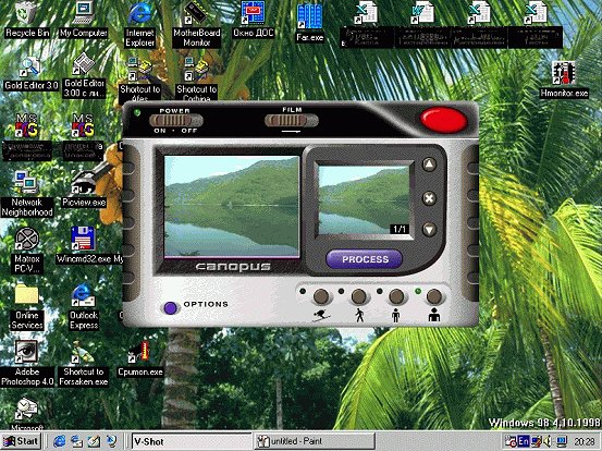 Вот это прием сигнала NTSC (в левом окне) и отображения капчинга (в правом окне). Красной кнопкойпроизводится до 6 капчингов, потом можно кнопками "вверх" и "вниз" выбрать нужныйвариант, а кнопкой "Process" завершить выбор. После выбора можно кнопкой "Х" удалитьиз буфера все ненужное. Программа V-Shot позволяет выбрать вид видеосъемок: быстрая смена кадров(бег, движение), медленная смена кадров, а также размер изображения: обычный (640х480) или огромный(1500х1100). Все это понадобится потом, для программы обработки капчинга, после выбора нужного кадракнопкой "Process". Далее идет вызов графического редактора, который также поставляется отCanopus, где полученный кадр можно подретушировать и записать в виде файла в любом из известныхграфических форматов.