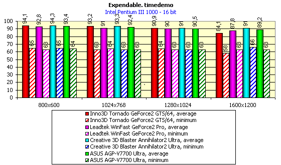 Результаты показывают, что в 16-битном цвете везде производительность видеокарты "уперлась" в частоту центрального процессора, и даже мощности 1 ГГц процессора недостаточно для реализации потенциала GeForce2 Ultra (хотя возможно, что данный тест Expendable уже себя исчерпал, и при дальнейшем росте частот CPU прирост будет незначительным). Играбельность находится на очень высоком уровне везде, поэтому комментарии излишни.