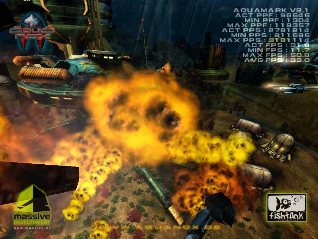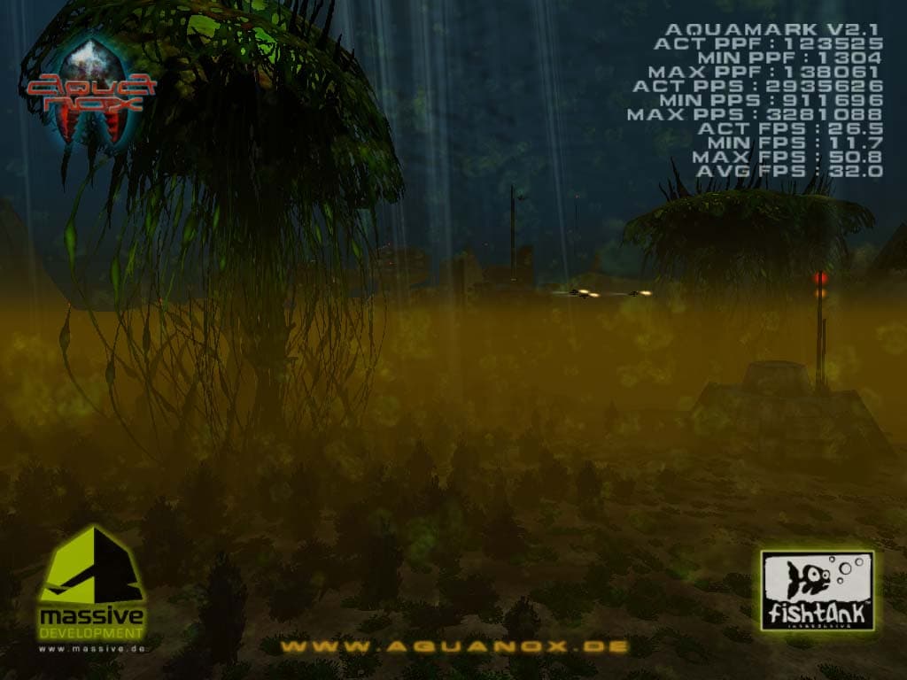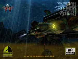 Конечно, можно ожидать, что при выпуске уже готовой игры разработчики в число настроек введут достаточно число опций, чтобы можно было облегчить ситуацию с такими нагрузками на акселераторы, а иначе просто никто играть не сможет в такие игры. К тому же, до выхода игры еще далеко, и потому следует ждать оптимизаций ее движка, что должно способствовать увеличению производительности видеокарт в AquaNox. Ниже представлены скриншоты из этого теста: