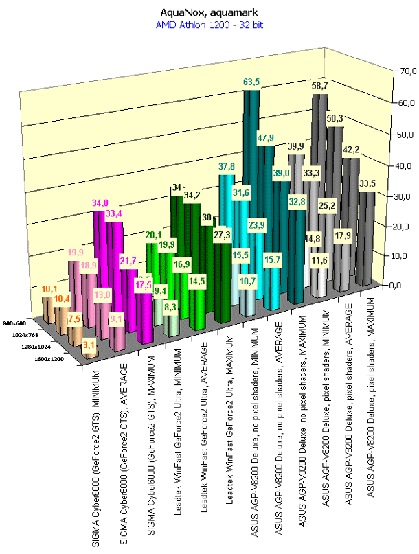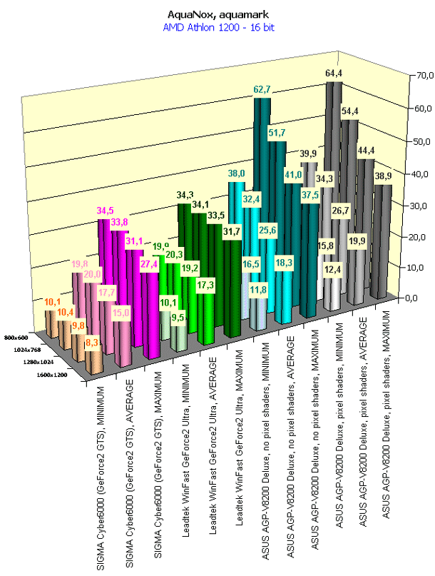 Да, вот это тест! Даже такая махина, как ASUS AGP-V8200 Deluxe не смогла не провалиться до минимальных значений, намного ниже предела играбельности! А про другие карты и говорить нечего. К сожалению, ATI RADEON не заработал на этом бенч-марке (говорить о заточенности AquaMark под карты на чипах от NVIDIA не приходится, так как многие иные платы например, Matrox G400, работают в этом тесте без сбоев). И как в случае с Giants, жесткая ситуация с очень тяжелыми сценами выводит ASUS AGP-V8200 Deluxe в лидеры даже в 16-битном цвете.