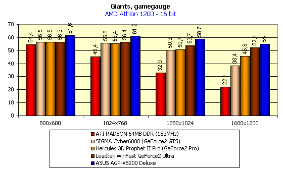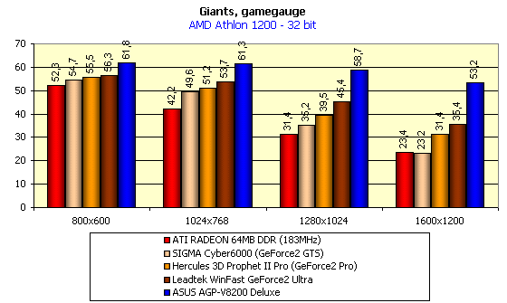 Весьма хорошо видно, что в низких разрешениях в основном играет роль частота центрального процессора, однако, заметьте, что в 16-битном цвете GeForce3 уже не отстает от GeForce2 Ultra. Очень сильная нагрузка, которую дает игра на видеокарты, сказывается, и даже более высокая частота у GeForce2 Ultra не спасает карту на этом GPU от проседания ниже, чем у ASUS AGP-V8200 Deluxe. Соответственно, в 32-битном цвете последняя ушла в еще больший отрыв от соперников. Как видно, общий фон производительности не столь высокий, множество эффектов и очень сложные сцены привели к тому, что даже ASUS AGP-V8200 Deluxe не смогла выдать более 61 fps в 32-битном цвете. Впрочем, для игр класса Giants (одиночные) это не столь важно, там сотни FPS просто не требуются.