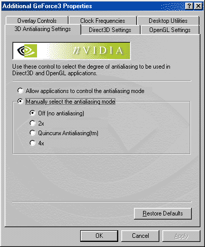 Мы уже подробно рассматривали проблему качества в 3D у видеокарт на базе GeForce3 в нашем первом обзоре, а также в 3DGiТогах эти моменты очень подробно освещены (имеются даже две галереи скриншотов). Рекомендую почитать эти материалы, а также подраздел в 3DGiТогах, связанный с анизотропной фильтрацией.