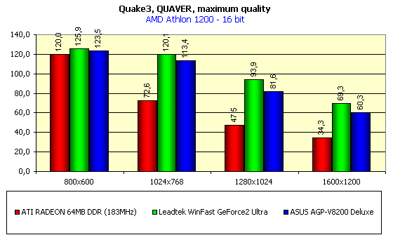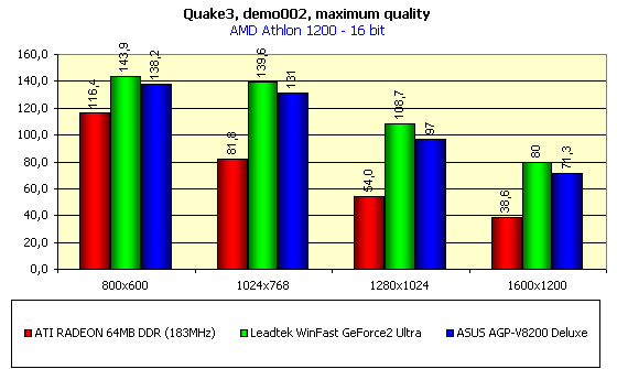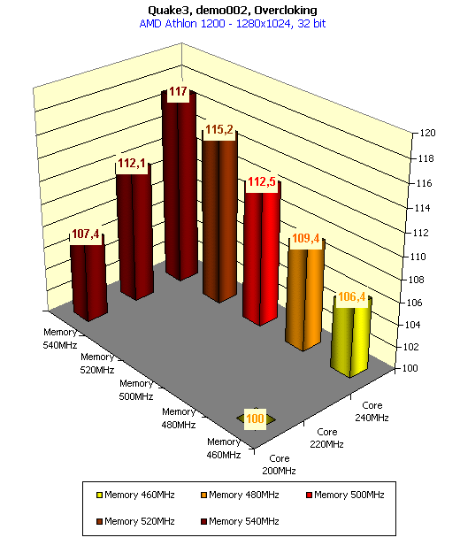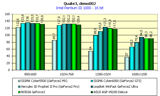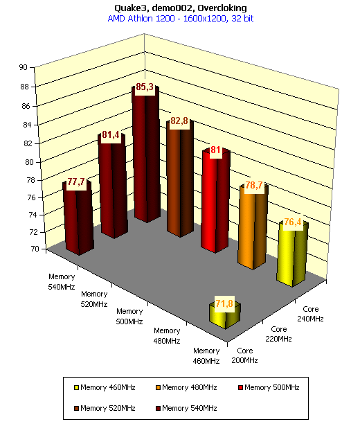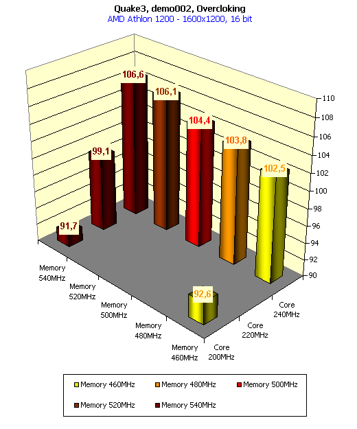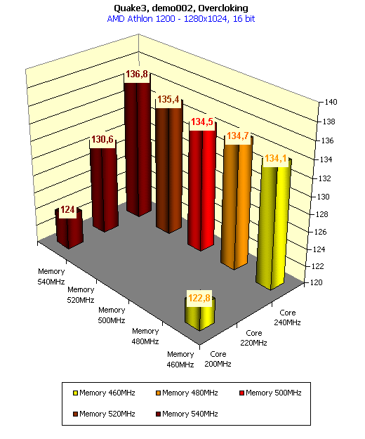 Тестирование проводилось в двух режимах: Fast (демонстрирует работу карты в 16-битном цвете) и High Quality (демонстрирует работу карты в 32-битном цвете). Использовались два разрешения: 1280х1024 и 1600х1200, поскольку в более низких разгон видеокарты почти не оказывает никакого влияния на производительность из-за влияния частоты центрального процессора.