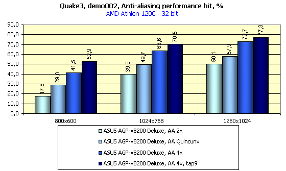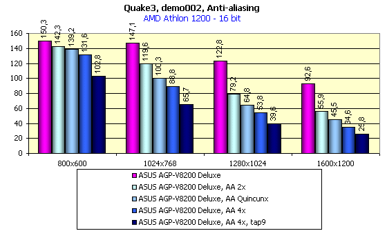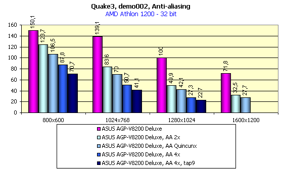 Как видно из диаграмм, очень хороший уровень играбельности при АА всех типов дает разрешение 800х600, в 1024х768 можно комфортно играть при 32-битном цвете при АА Quincunx (а более тяжелая степень АА, собственно, и не нужна, качество, получаемое при Quincunx очень высокое). А в некоторых играх и в 1280х1024 АА дает возможность получить приличную играбельность.