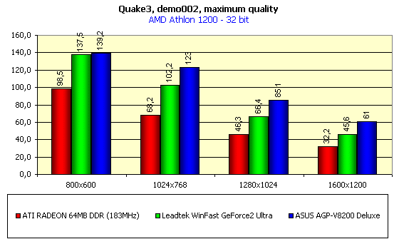 Этот тест нам просто показывает положение флагмана 3D-игровой графики в линейке чипсетов от NVIDIA. Хорошо видно, что в 16- битном цвете GeForce3 отстает от предшественника GeForce2 Ultra (мы уже говорили об этом в нашем первом обзоре), но зато в 32-битном цвете это безусловный король. Видеокарта ASUS AGP-V8200 Deluxe продемонстрировала производительность на уровне ранее рассмотренных карт на этом чипсете.
