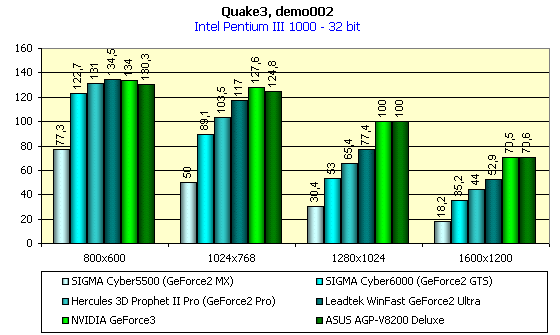 Как мы видим, картина повторяется и при более жестких условиях, GeForce3 немного отстает от GeForce2 Ultra в 16-битном цвете, но зато резко вырывается вперед в 32-битном.