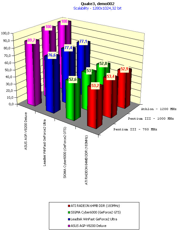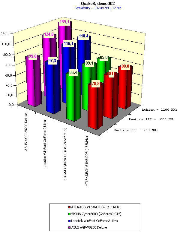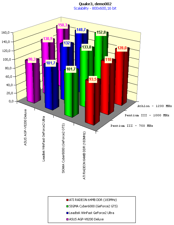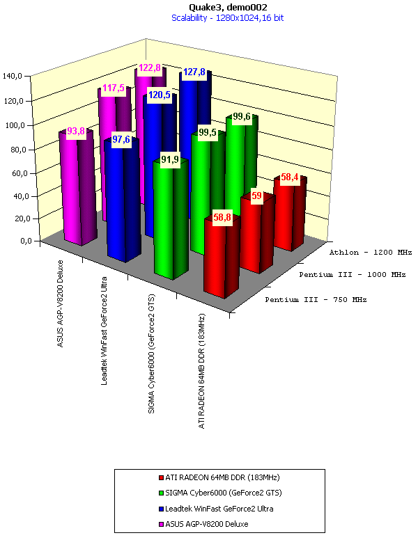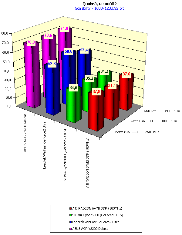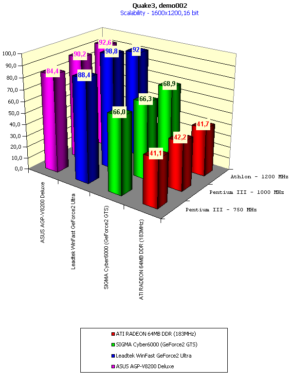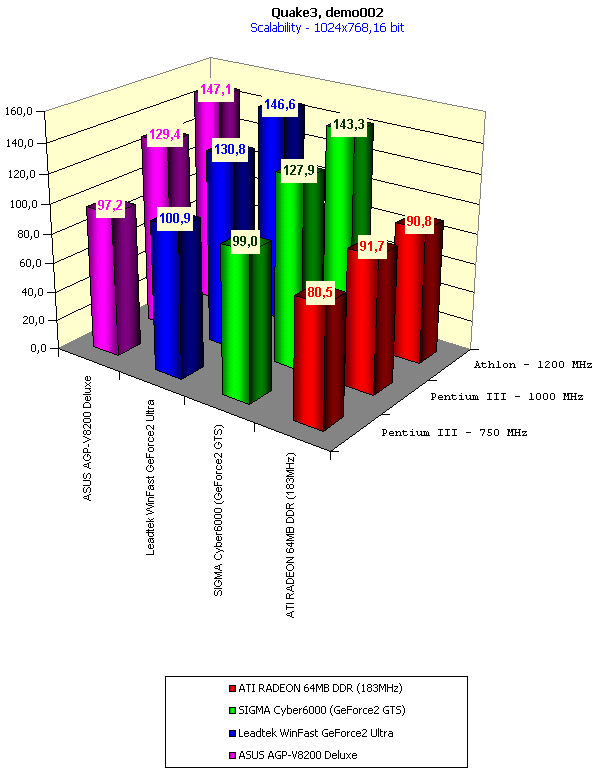 По итогам этого исследования мы очень хорошо видим, что приобретать видеокарту класса ASUS AGP-V8200 Deluxe имеет смысл только владельцам высокочастотных центральных процессоров (от 1 ГГц и выше). Даже такая относительно высокая частота в 750 МГц (а у многих российских пользователей даже такие частоты — еще в диковинку) сильно урезает потенциал видеокарты, делая ее выгодной только в очень высоких разрешениях.