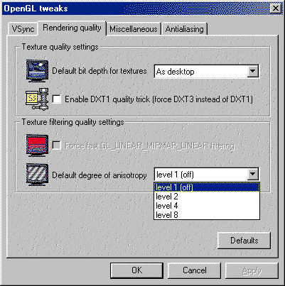 C помощью Riva Tuner можно корректно включать анизотропную фильтрацию не только в OpenGL (где настройки в драйверах позволяют это сделать), но и в Direct3D (а не копаться в Registry в поисках нужных ключей). Мы уже писали ранее о возможности включения у GeForce3 трех степеней анизотропии: при выборке 8-ми, 16-ти и 32-х текстурных сэмплов. Последняя степень — самая красивая по эффекту, но одновременно и очень прожорливая в плане падения производительности. Об этом можно почитать в нашем обзоре по GeForce3.