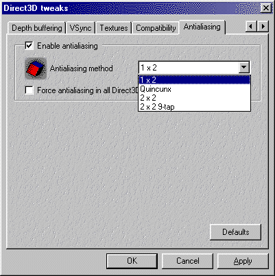 Riva Tuner дает возможность включить анти-алиасинг (эффект сглаживания неровных краев объектов) не только по документированному NVIDIA списку степеней, но и убранную из настроек в драйверах высшую степень MSAA — 2x2tap9, которая использует выборку не из 4-х субпикселей (2х2), а из 9-ти (3х3) (как бы залезая по маске в соседние квадраты выборки), но при этом разрешение для рендеринга увеличивается не в 9 раз, а в 4. Что позволяет получить более высокое качество анти-алиасинга, чем при простой степени 2х2. Посмотрите, что дает в этом плане панель настроек NVIDIA — драйверов: