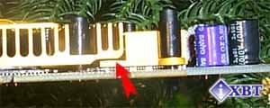 Однако, на первый взгляд, целостная конструкция на деле оказывается вовсе не такой. Центральный и боковые радиаторы друг с другом не соприкасаются (это видно на фотографии справа, стрелкой отмечена щель между радиаторами), поэтому вентилятор охлаждает только центральный радиатор. Если посмотреть на фотографию выше справа, то можно увидеть, что ради такого стильного дизайна верхний радиатор потерял значительную часть ребер, и поэтому не столь эффективен, как, например, элемент, охлаждающий вертикальный ряд микросхем и расположенный справа.