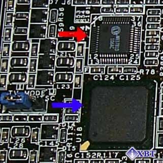 Если обратить внимание на левую сторону PCB, то внизу можно увидеть микросхему термоконтроля (отмечена красной стрелкой), а также модуль Philips 7100, отвечающий за VIVO (Video Input, Video Output) — он отмечен синей стрелкой (к сожалению, маркировка на нем настолько нечеткая, что подбор разного ракурса и освещения для ее демонстрации не помог).