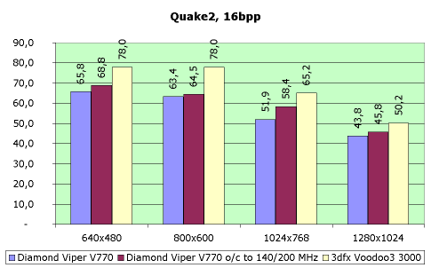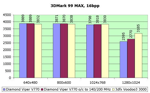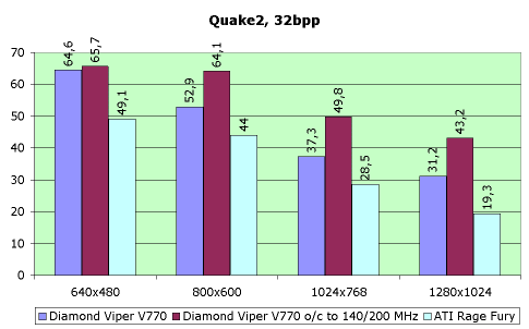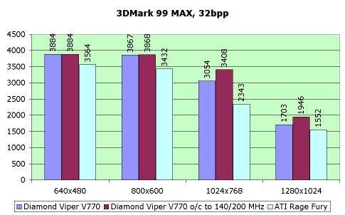 Теперь о 3D-графике. Если говорить о производительности Diamond Viper V770 сравнительно с ASUS V3800 в штатном неразогнанном режиме (140/150 МГц), то она у обоих карт одинаковая. Действительно, частоты и памяти, и чипсета, главным образом влияющие на скорость, не отличаются ни у той, ни у другой платы.