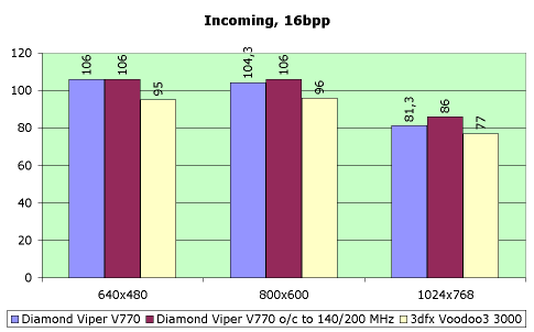 Выводы: полное фиаско в скорости при 16-ти битном цвете по сравнению с Voodoo3 3000 (небольшое преимущество в Incoming не дает оправдания Riva TNT2 (140/200) в столь плачевных результатах). А ведь мы сравнивали всего лишь с неразогнанным Voodoo3 3000!