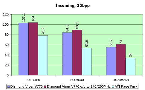 "А что день грядущий нам готовит?" Вот таким риторическим вопросом Ленского мы вопрошаем, думая о появлении игр с полной поддержкой 32-битного цвета. Рассмотрим позиции Diamond Viper V770 (а значит и Riva TNT2 на частотах 140/200 МГц) в работе с 32-битным цветом в 3D. А вот здесь все отлично. Правда, в Incoming преимущество немного ниже, но все равно: V770 в данном режиме — лидер. Мы не можем сравнить в этом режиме Viper с Voodoo3, поэтому для сопоставления взяли одну из мощнейших карт последнего поколения, особенно прославившуюся своим 32-битном цветом — ATI Rage Fury (у Rage128 тоже два конвейера рендеринга). Да, поэтому мы можем сказать, что Riva TNT2 (140/200 MHz) для дня грядущего вполне готова. :)