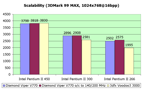 Тем не менее, пойдем далее. Нам осталось прокомментировать работу Viper V770 на разных частотах процессоров. Как видно на диаграмме, особых отличий от неразогнанной Riva TNT2 (140/150) тут нет.