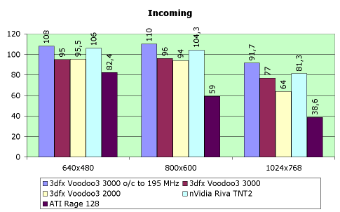 Что же можно сказать относительно скорости работы Voodoo3 3000? Примерно то же, что и сказано было ранее о Voodoo3 2000: скорость потрясает воображение, в режиме работы на 195 МГц вообще на сегодняшний день равных ей нет (с учетом даже протестированной ранее платы на базе Riva TNT2 от ASUS). Но при работе на штатной частоте 166 МГц Voodoo3 3000 немного уступает ASUS V3800 (чипсет Riva TNT2, частота работы 140/150 Мгц на чипсете и памяти соответственно) в игре Incoming, которая характеризует работу видеокарты в Direct3D. Во всех иных тестах Voodoo3 3000 лидирует даже в штатном режиме. Однако же, повторю, что видеокарта дает явный прирост в скорости только на мощнейших процессорах (от 450 МГц) и в высоких разрешениях (от 1024х768 и выше). С другой стороны, и на более слабых процессорах Voodoo3 3000 (как и Voodoo3 2000) не уступает по скорости Voodoo2 SLI. Поэтому с точки зрения скоростных показателей обе разновидности Voodoo3 можно рассматривать как замену Voodoo2 SLI, причем разница между Voodoo3 2000 и 3000 на слабых процессорах практически ничтожна, что ставит 2000-ю модель в более выгодное положение.