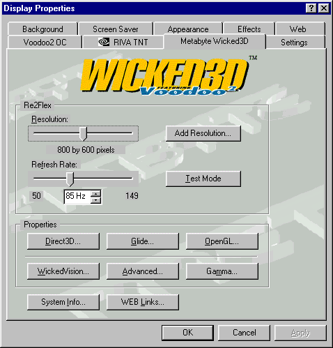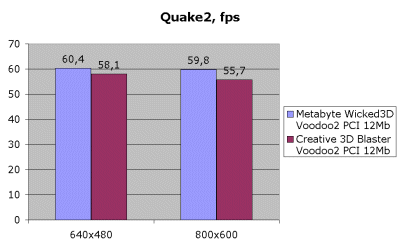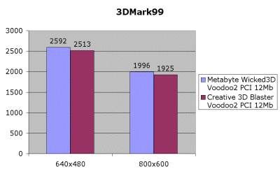 Для сравнительного тестирования была взята плата Creative 3D Blaster Voodoo², которая по внешнему виду оказалась очень похожа на Wicked3D. Причем, драйвера от Метабайт установливались прекрасно и на плату от Creative, а драйвера от Creative - на плату от Metabyte. Тем не менее, для чистоты эксперимента я протестировал каждую плату со своими драйверами, и вот что получилось: