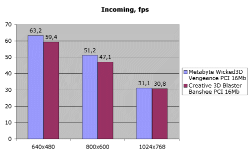 Тестирование проводилось в сравнении с Creative 3D Blaster Banshee, которая внешне очень похожа на Vengeance. Испытания проводились на том же компьютере, что и карты на Voodoo². Результаты представлены ниже: