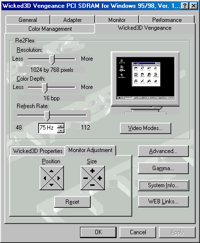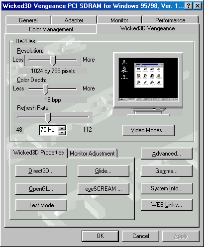 - возможность установки режимов работы монитора по разрешению и рефрешу, а также кнопки вызова регулировок работы видеокарты под API Direct3D, Glide, OpenGL и других настроек:
