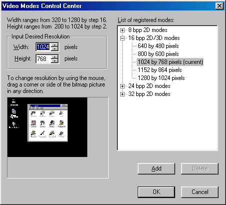 - изменение разрешений экрана с привязанными к ним значениями частот вертикальной развертки. Если какой-либо режим отсутствует, то его можно создать кнопкой "Add resolution":