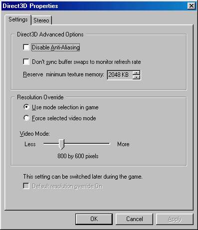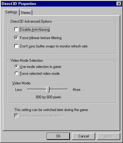 - Настройки Direct3D: есть возможность включения режима эффекта сглаживания (anti-aliasing), а также Vsync, как и в случае с Voodoo² можно выставлять общие для всех приложений режимы экрана, а можно отдавать это на откуп самим приложениям: