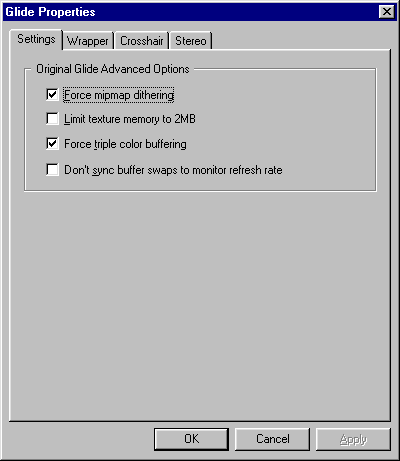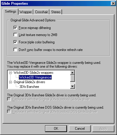 - Настройки Glide: есть возможность задать режим дизеринга, регулировать Vsync, включать тройную буферизацию, и снова регулировать работу приложений через тот или иной драйвер (если нужна поддержка стереоочков - то через соответствующий Glide-wrapper, если нет - то через оригинальный Glide2x.dll):