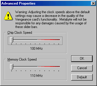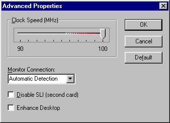 - Также имеется возможность регулировки частоты работы чипсета и памяти. Вот тут интересная деталь: как известно, по умолчанию, на практически всех Banshee-картах и чипсет, и память работают на 100 МГц. Здесь же по памяти просто невозможно выставить 100, минимальное значение - 110 МГц. Значит, специалисты Wicked3D посчитали, что такая память (8 нс) вполне может нормально работать на повышенной частоте.