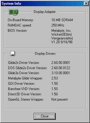 Также хочу отметить тот факт, что при установке драйверов, по умолчанию стоят значения частот чипсета и памяти еще выше: соответственно, 105 и 115 МГц. Что, конечно же, не могло не сказаться на результатах тестирования, - скорости везде были выше. Однако же, это не привело к неустойчивой работе видеокарты. - Справочная информация представлена, как и в случае Voodoo², данными о видеокарте и программном обеспечении к ней.