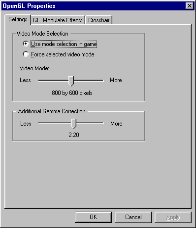 - теперь, рассмотрим установки OpenGL. Первая закладка - это регулировка режима работы приложений в том или ином разрешении и установка гаммы цветов для OpenGL приложений (что важно, учитывая затемняющий эффект очков):