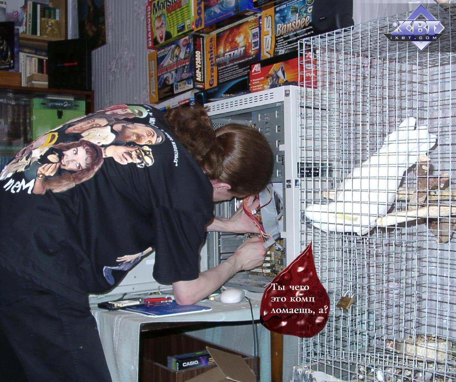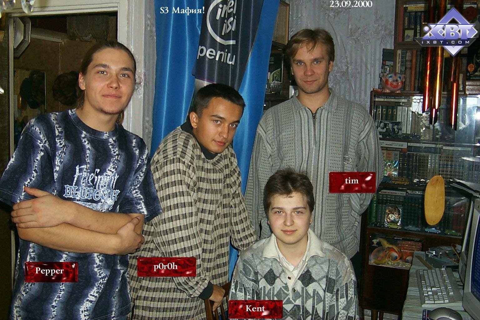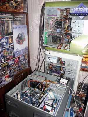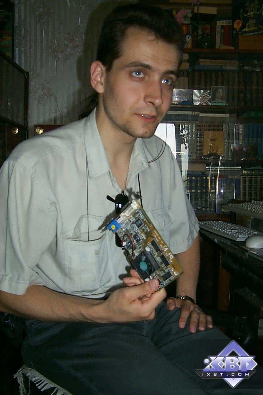 Надо сказать, что некто tim, а именно самый высокий из всей команды (потому он взял себе ник smalltim :-) ), впоследствии стал ведущим редактором по видеосистеме на Ф-Центре и xbitlabs.com, а сейчас он работает в NVIDIA инженером. Его модифицированная карта Savage 2000 (где увеличено напряжение на чипе и памяти) до сих пор находится у нас в музее, и даже одно время принимала участие в сводных тестированиях видеокарт прежних выпусков (когда еще хоть какие-то игры работали на таких платах). Ее можно увидеть на первой фотографии (из представленных ниже) — чуть правее и ниже от часов с кукушкой (у платы на чипах памяти установлены радиаторы, на них еще есть отпечатки пальцев самого smalltim-а :-) ).